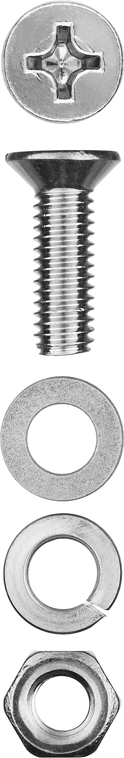 Набор состоит из винтов с потайной головкой DIN 965, гаек шестигранных DIN 934, гроверных шайб DIN 127 и плоских шайб DIN 125;