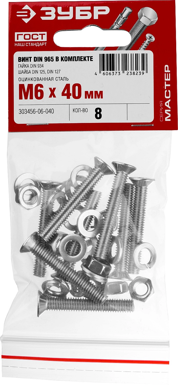 ПроизводителиКомплект (винт, гайка, шайба, гровер) DIN965,934,125,127 оцинк. M6x40, 8шт. (303456-06-040) ЗУБР