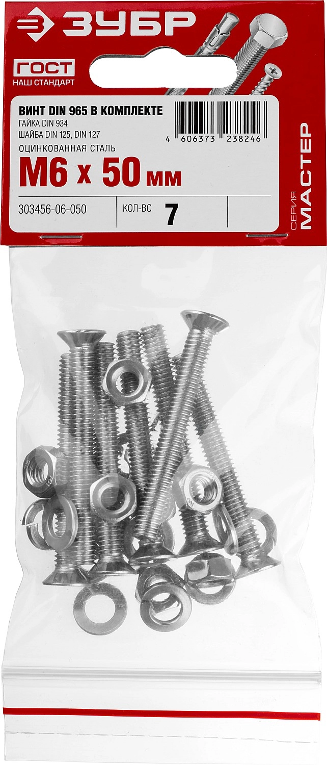 ПроизводителиКомплект (винт, гайка, шайба, гровер) DIN965,934,125,127 оцинк. M6x50, 7шт. (303456-06-050) ЗУБР