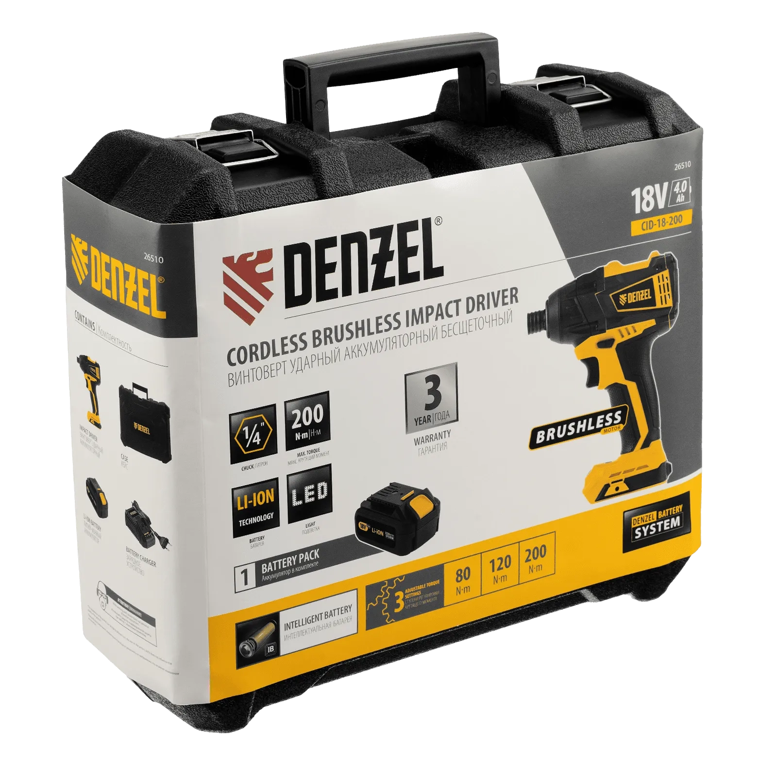 Ударный аккумуляторный винтоверт Denzel CID-IB-200 26510 с бесщеточным двигателем работает от батареи Li-Ion с рабочим напряжением 18 В и предназначен для завинчивания и отвинчивания винтов и шурупов, а также затягивания и откручивания гаек. Эффективен для демонтажа перетянутого и закисшего крепежа, закручивания длинных болтов и шурупов. Пригодится для сборки мебели и различных конструкций.;Аккумуляторный винтоверт не зависит от стационарного источника энергии. Интеллектуальная батарея емкостью 4 А/ч с защитой от перезаряда и глубокого разряда не имеет эффекта памяти, благодаря чему обеспечивает стабильную работу инструмента на протяжении длительного времени.