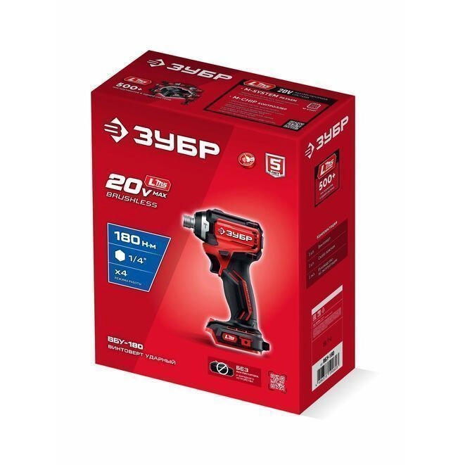 ПроизводителиВинтоверт ударный аккум. ВБУ-180 (LMS) (20.0 В, без АКБ и ЗУ, HEX 1/4", 180 Нм, кор.) ЗУБР