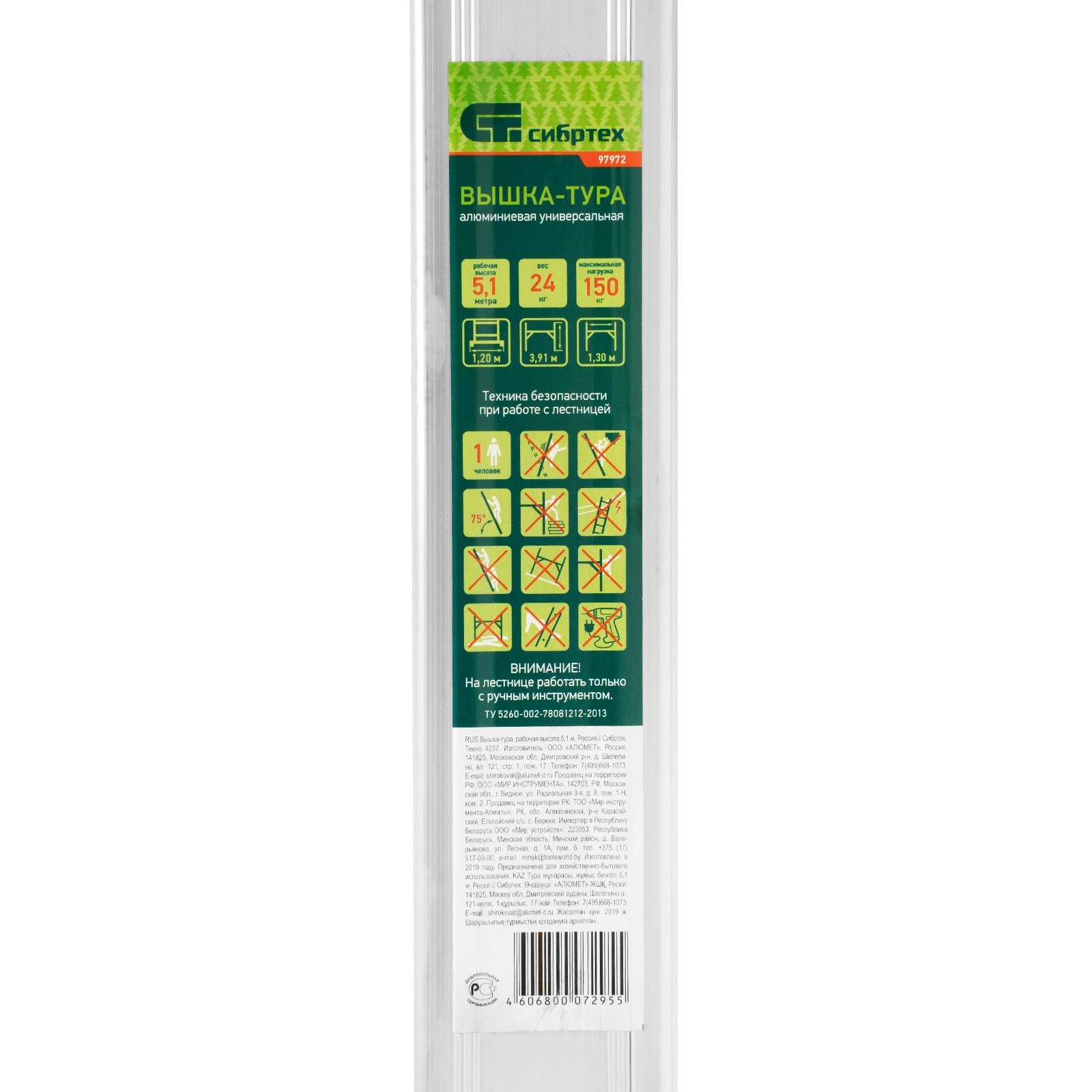ПроизводителиВышка-тура алюминиевая, 5.1м, 16 ступеней (97972) СИБРТЕХ