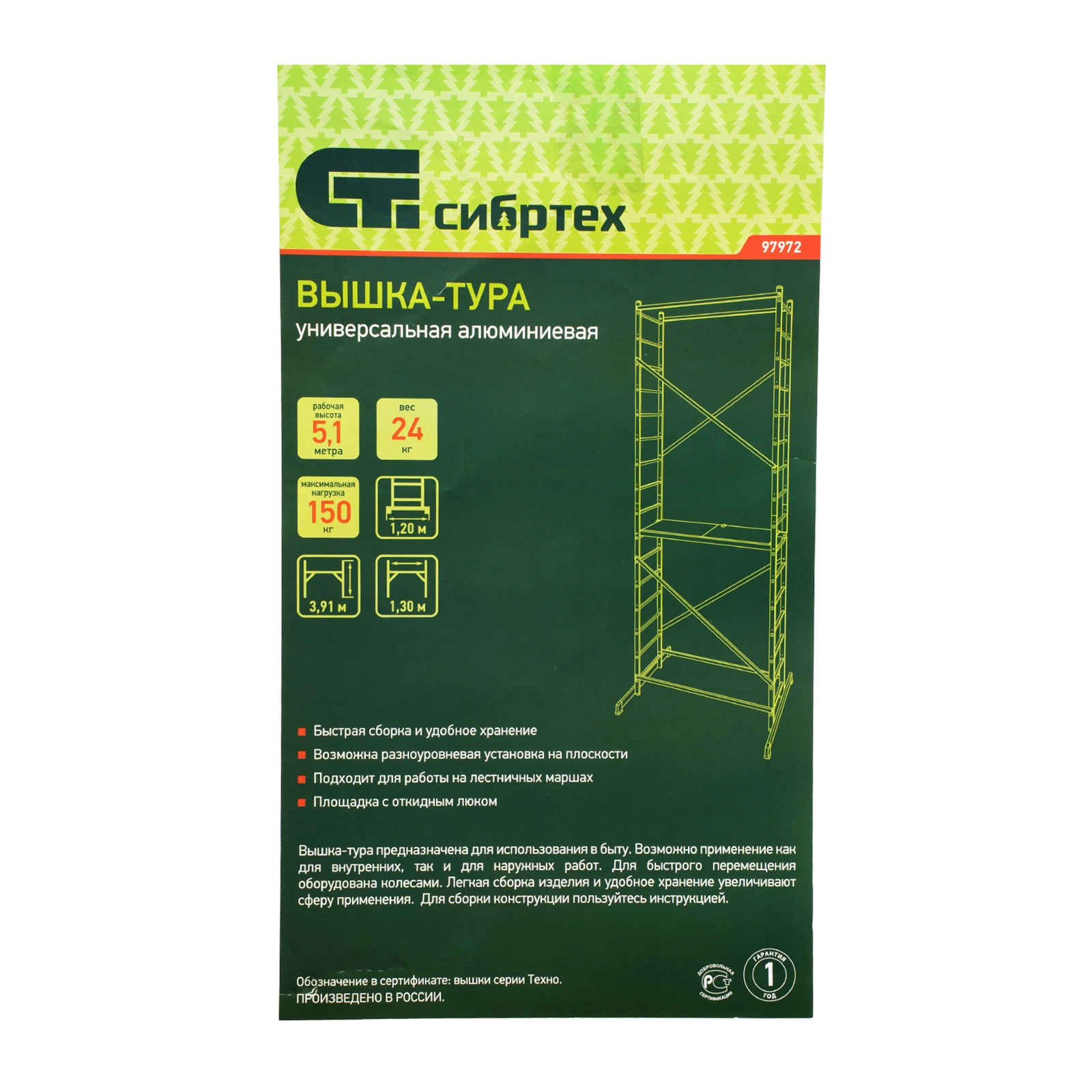 Вышка-тура 97972, рабочая высота 5,1 м, используется для проведения строительных, ремонтных, отделочных и монтажных работ на высоте.