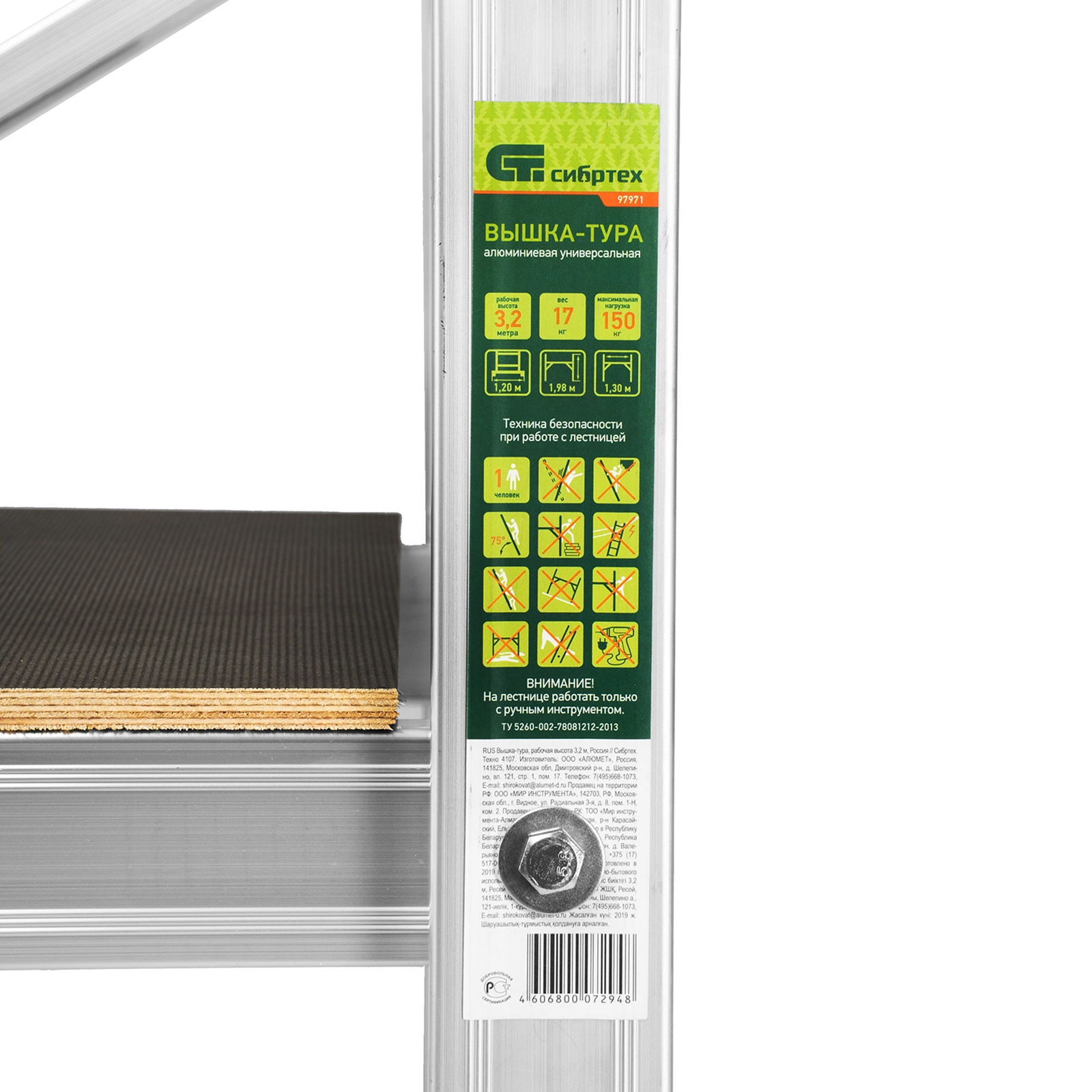 ПроизводителиВышка-тура алюминиевая, 3.2 метра, 7 ступеней (97971) СИБРТЕХ