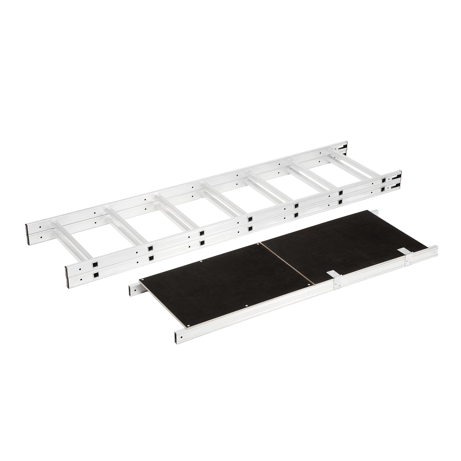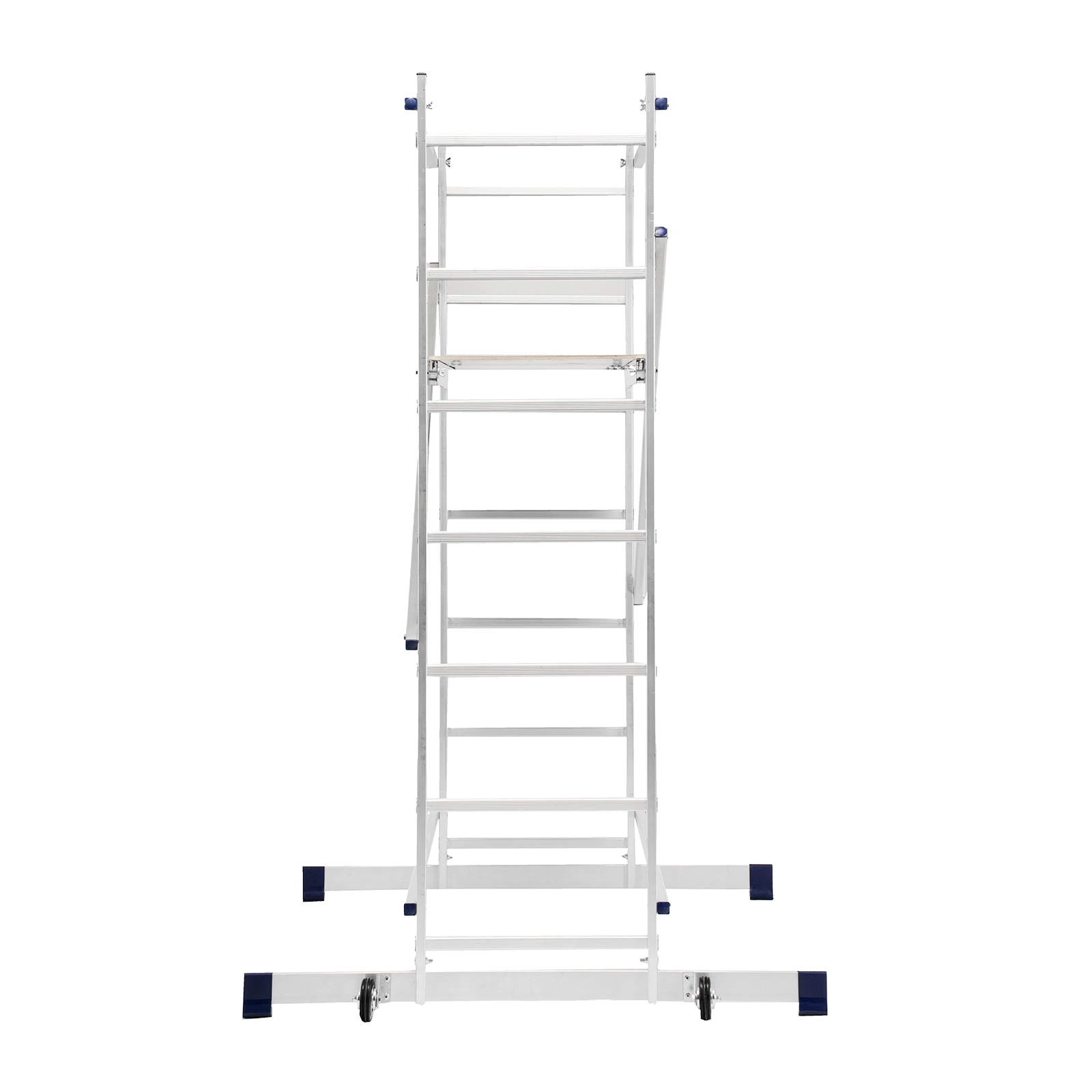 Помост можно фиксировать на разных уровнях стоек, что удобно при установке конструкции на лестничных пролетах и других наклонных поверхностях.