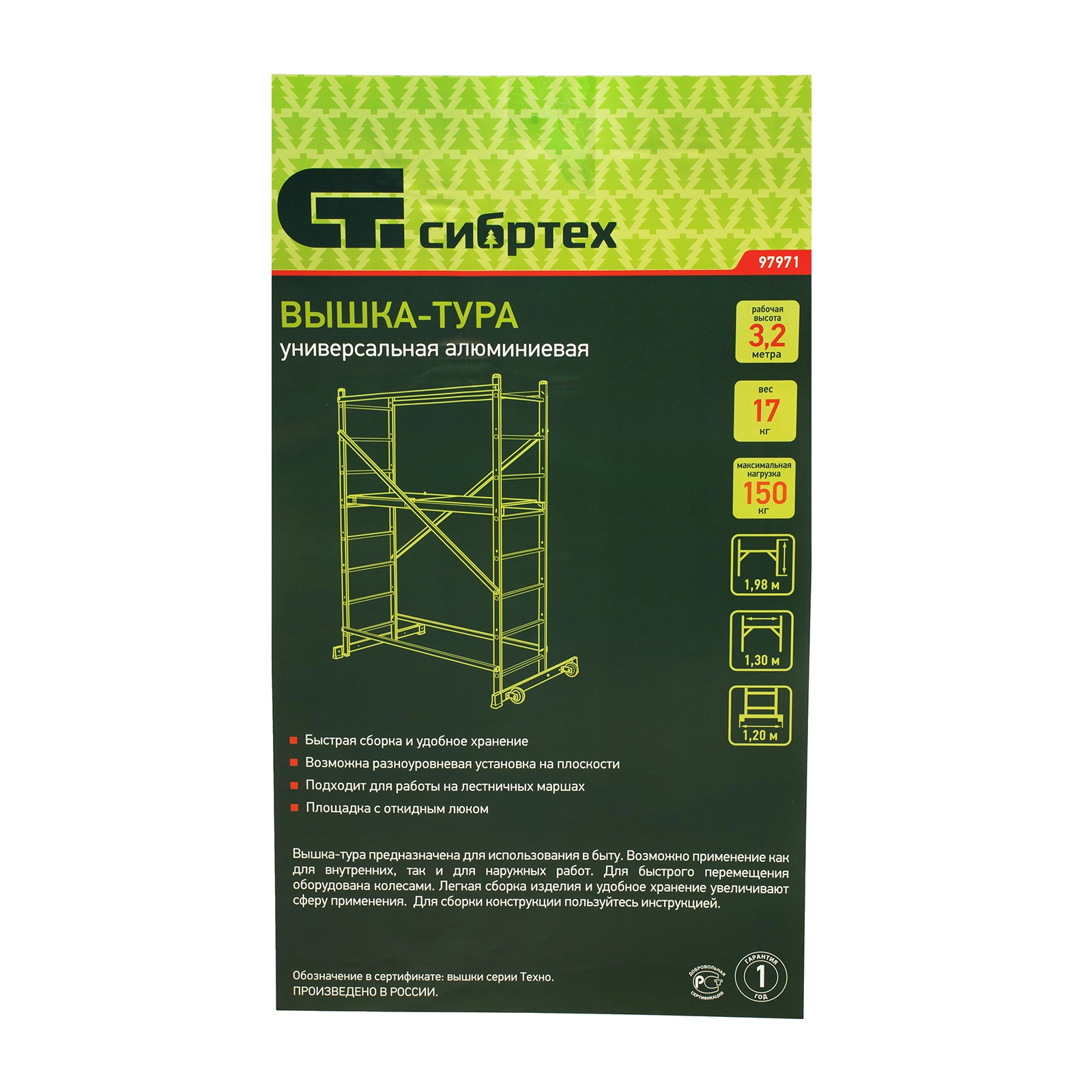 СТАНДАРТУровень качества. При классификации продуктов, имеющих схожее наименование, но обладающие различными потребительскими свойствами мы приняли следующий Вес факторов: 80% - подтвержденный ресурс, 15% - заявленная производительность/скорость, 5% - субъективные ощущения потребителя. ПодробнееКод товара: 0064481(0)Вышка-тура 97971, рабочая высота 3,2 м, используется для проведения строительных, ремонтных, отделочных и монтажных работ на высоте.