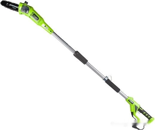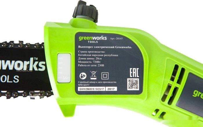 СТАНДАРТУровень качества. При классификации продуктов, имеющих схожее наименование, но обладающие различными потребительскими свойствами мы приняли следующий Вес факторов: 80% - подтвержденный ресурс, 15% - заявленная производительность/скорость, 5% - субъективные ощущения потребителя. ПодробнееКод товара: 0042700(0)ХарактеристикиАртикул 20147Бренды GreenWorksСтрана производства КитайГарантия 12 месяцевУровень звуковой мощности, дБ(A) 100Длина цепи 20Длина реза 20Тип двигателя электрическийВес 4.1Тип устройства высоторезДлина лезвия (для кустов) 200Описание товара обновлено 08.12.2025 15:15:09Высоторез/Сучкорез GreenWorks GPS7220. Это электрическая, проводная модель для подрезания ветвей на расстоянии до четырех метров от земли. Данная модель оснащена удобной 3-коленной составной штангой для работы на разных высотах. Оснащена механизмом ручного натяжения цепи, автоматической подачей масла и смазкой цепи. Для безопасной работы устройство оснащено системой защиты от случайного включения.