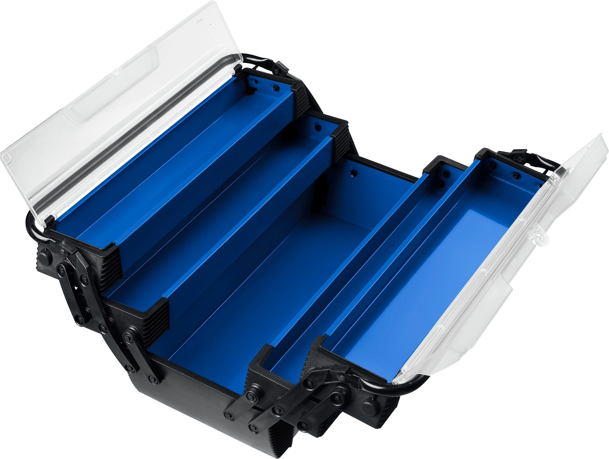 Ящик с раздвижными полками позволяет организовать удобное удобное хранение инструмента и доступ к нему. Широкая ручка помогает сместить центр тяжести ящика, что обеспечивает удобство и комфорт переноски