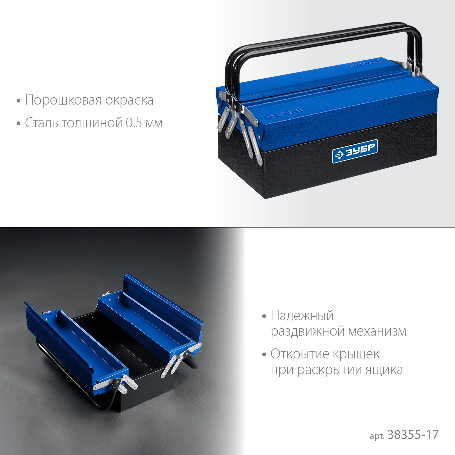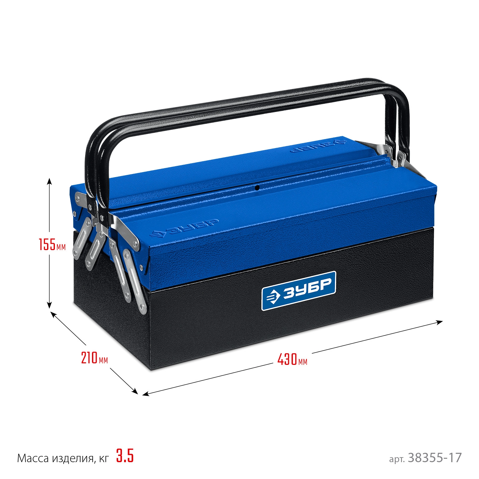 ПроизводителиЯщик для инструмента металлический, раздв., 3 секц., 430 х 210 х 205 мм (17″)(38355-17) ЗУБР