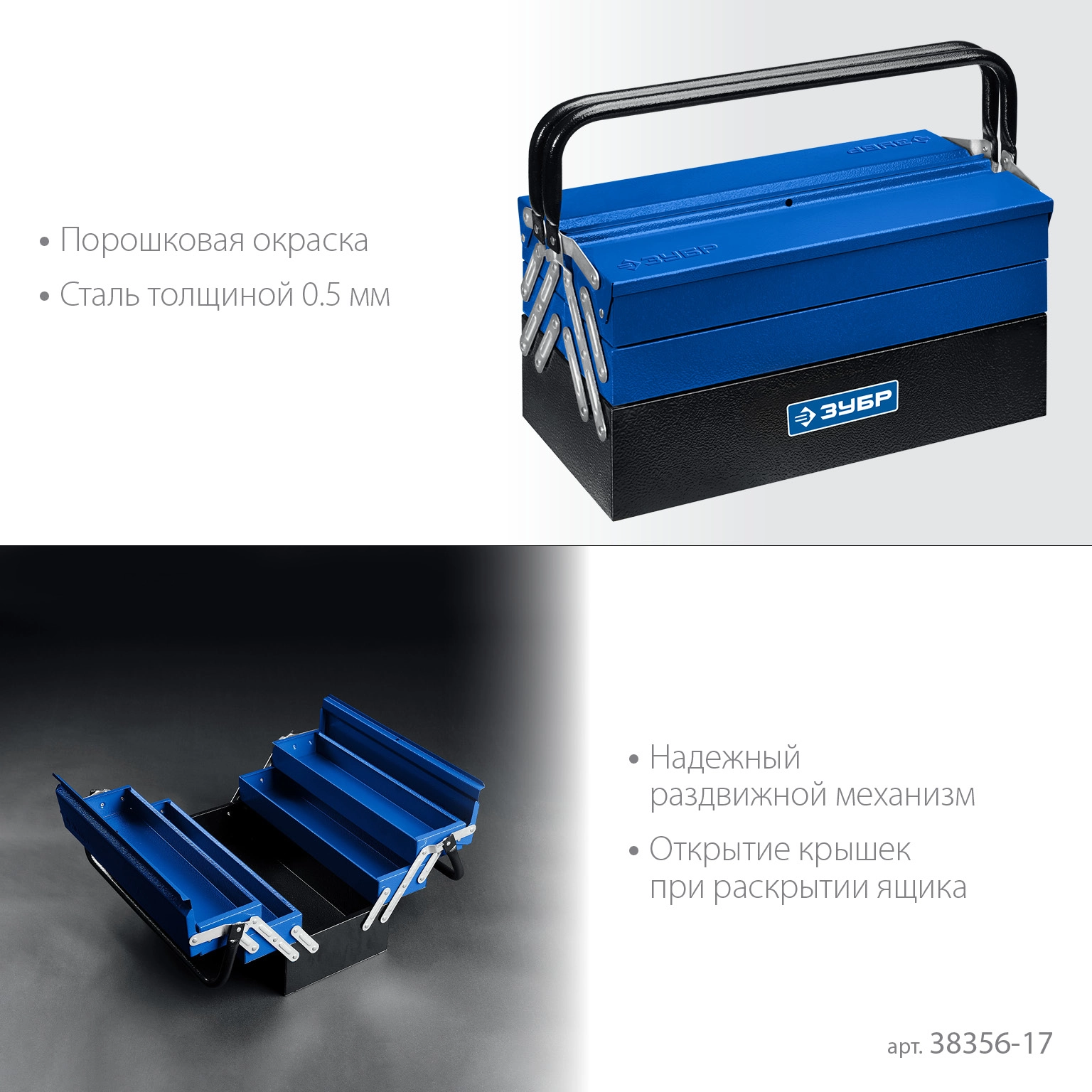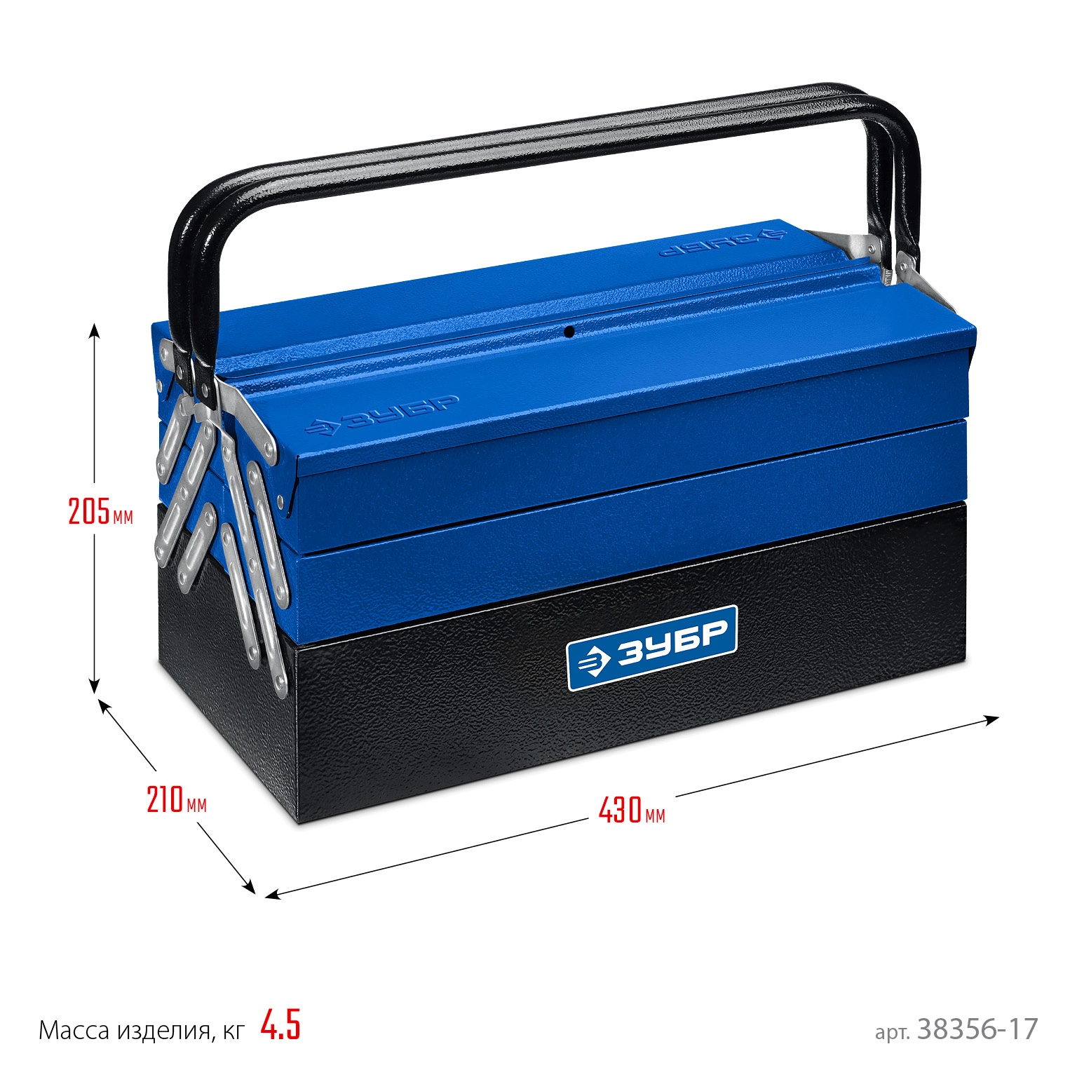 ПроизводителиЯщик для инструмента металлический, раздв., 3 секц., 430 х 210 х 205 мм (17″)(38356-17) ЗУБР