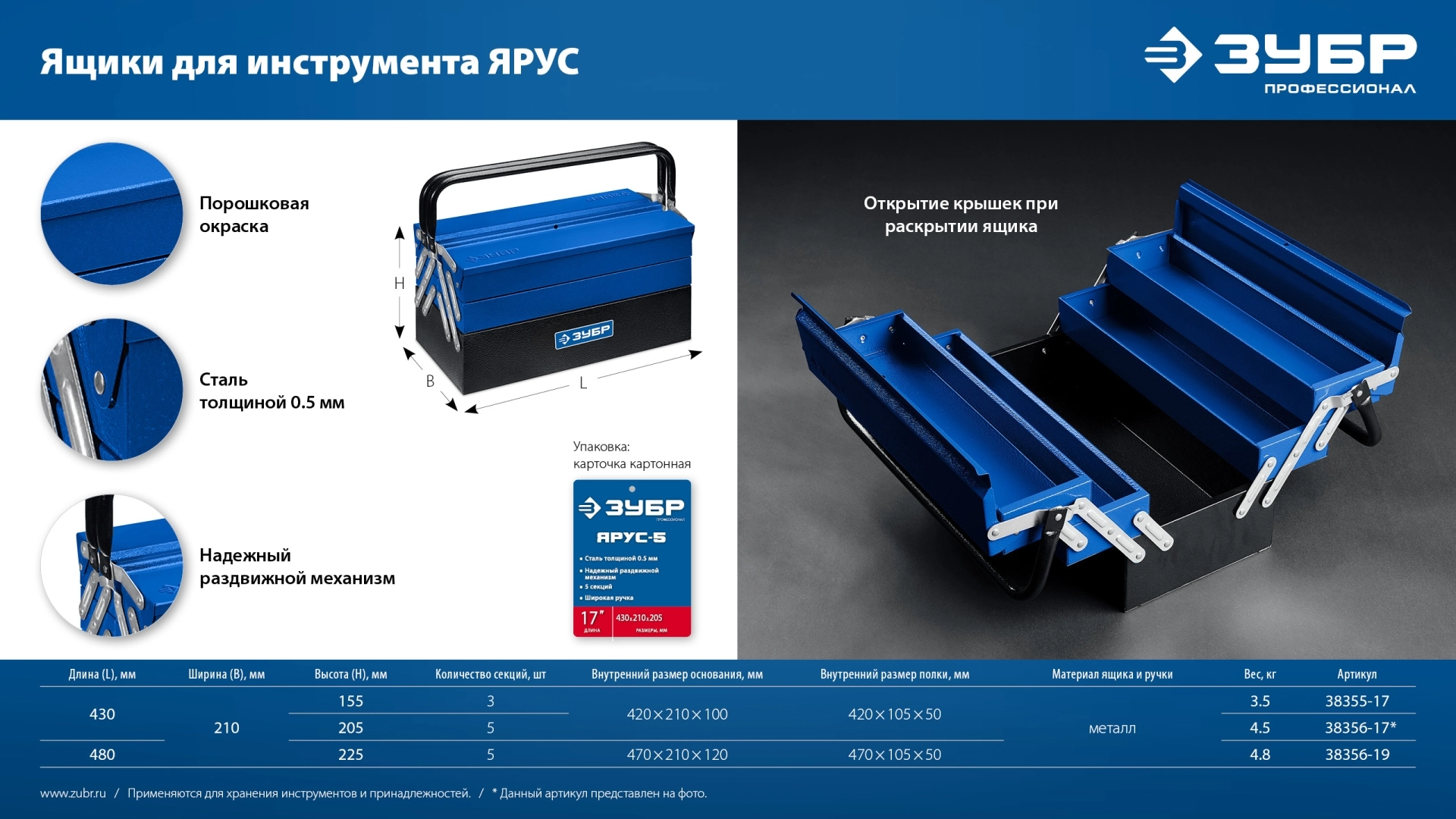 ПроизводителиЯщик для инструмента металлический, раздв., 5 секц., 470 х 210 х 225 мм (19″)(38356-19) ЗУБР