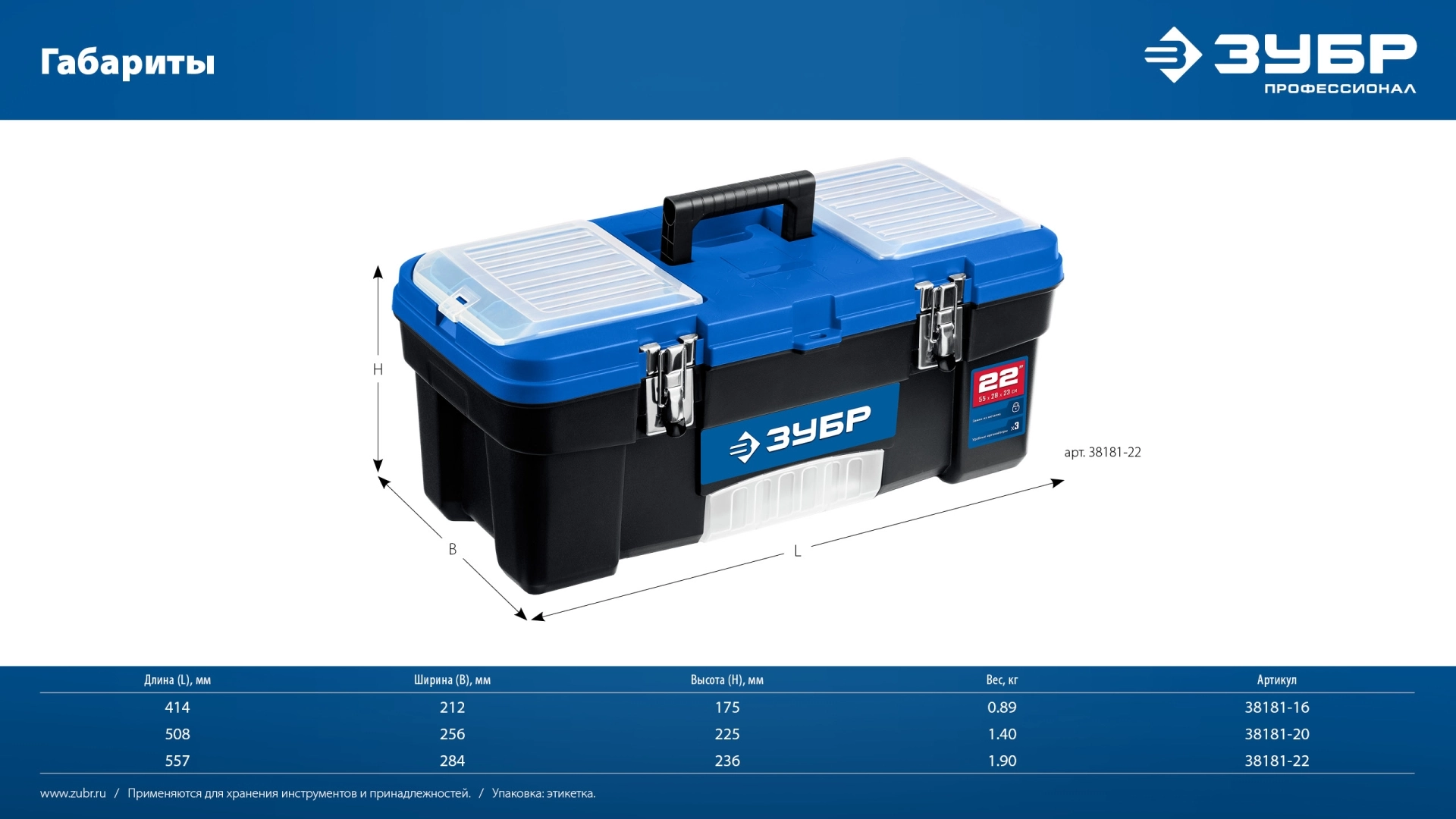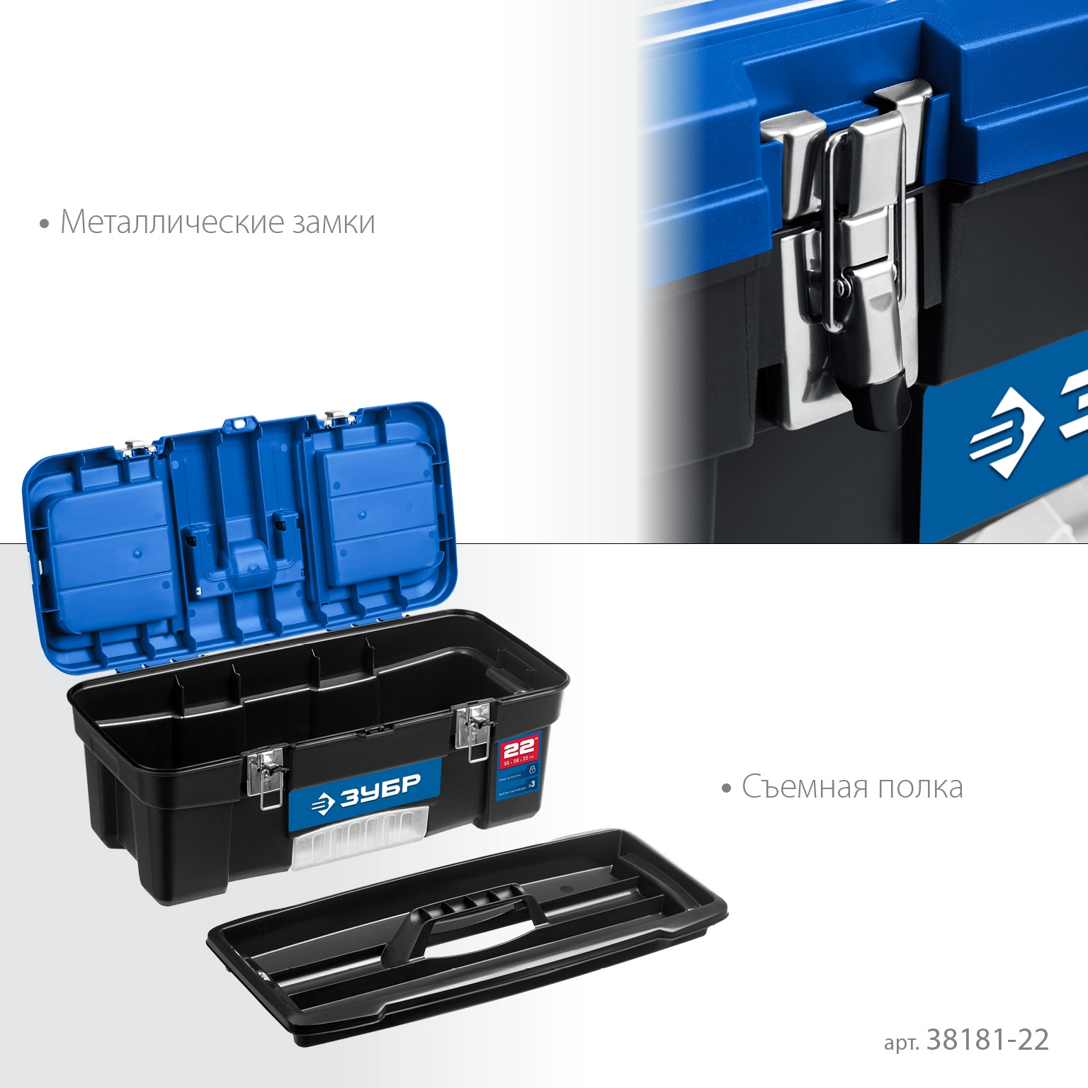 ПроизводителиЯщик для инструмента, пластиковый, 22", 557 x 284 x 236 мм, металл. замки (38181-22) ЗУБР