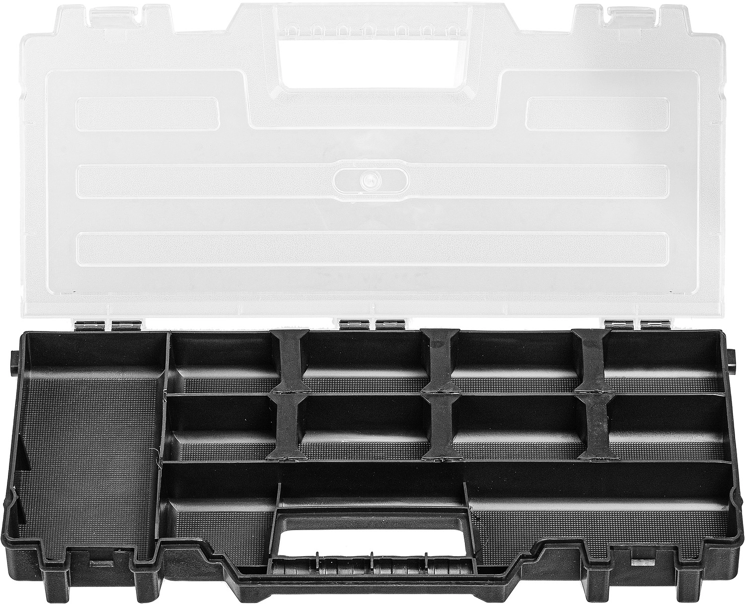 Ящик с встроенным органайзером и съемной полкой позволяет организвовать удобное и надежное хранение большого количества инструментов. Широкая алюминиевая рукоятка помогает сместить центр тяжести ящика если это необходимо