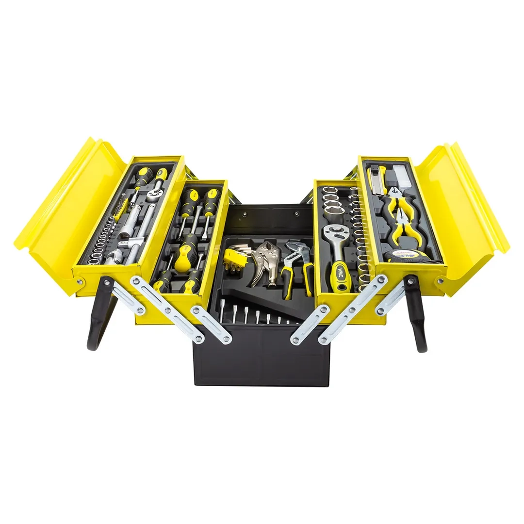 Профессиональный набор инструментов 87 предметов - это незаменимый набор для профессионала и новичка в ремонтных работах. В наборе собрано многообразие инструментов высокого качества, которые справляются отлично с различными видами работ. Стоит отметить, что все инструменты упакованы в складной металлический кейс. Компоненты набора инструмента в металлическом кейсе изготовлены из Cr-V стали, а детали приводного механизма храпового механизма изготовлены из хромомолибденового сплава (CR-Mo) для повышения прочности и долговечности храповиков. Реверсивная трещотка имеет простой кнопочный механизм разблокировки и рукоятки с резиновым покрытием, обеспечивающие комфорт и надежный захват. С этим универсальным набором инструментов вы сможете выполнить большинство ремонтов. Это один из лучших наборов инструментов для домашнего, коммерческого или аварийного использования в дороге. Набор инструментов в металлическом кейсе очень удобен как для механика или большинства домашних ремонтных работ.Производитель: