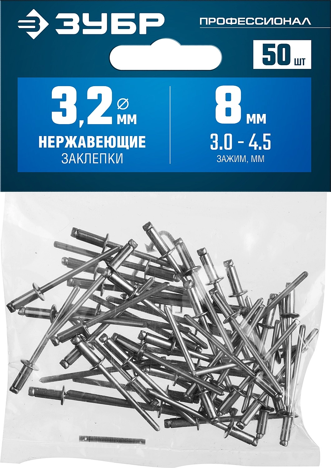 ПроизводителиЗаклепка вытяжная нержавеющая 3.2 x 8 мм, 50 шт. "Профессионал" (313166-32-08) ЗУБР
