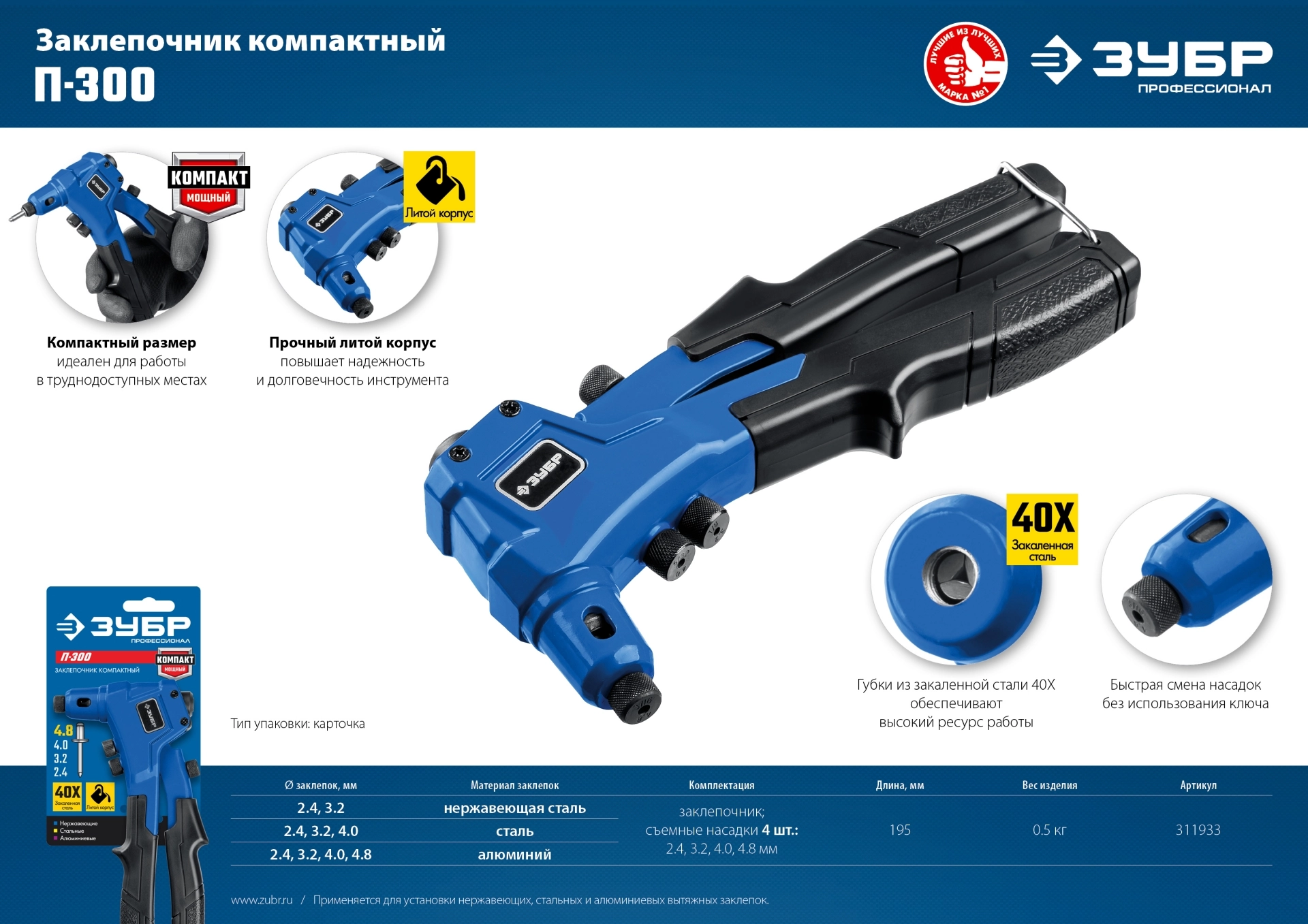 ПроизводителиЗаклепочник 2.4-4.8мм, литой, компактный "П-300""Профессионал" (311933) ЗУБР