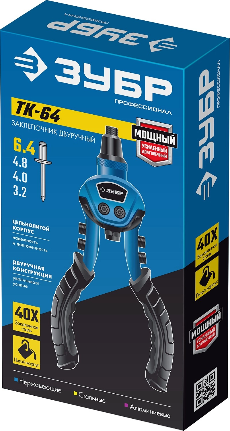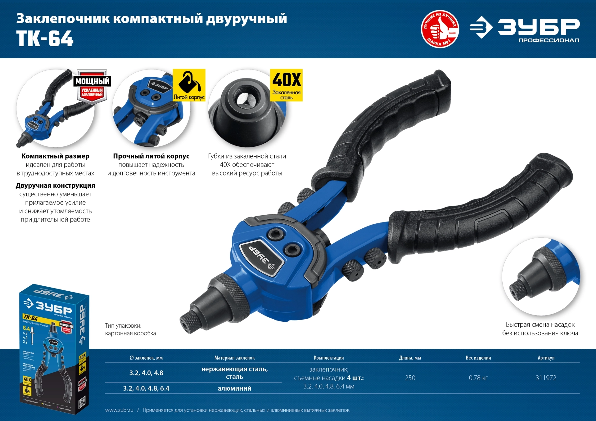 ПроизводителиЗаклепочник 2.4-6.4мм, силовой, двуручный, компактный 250мм "ТК-64" (311972) ЗУБР