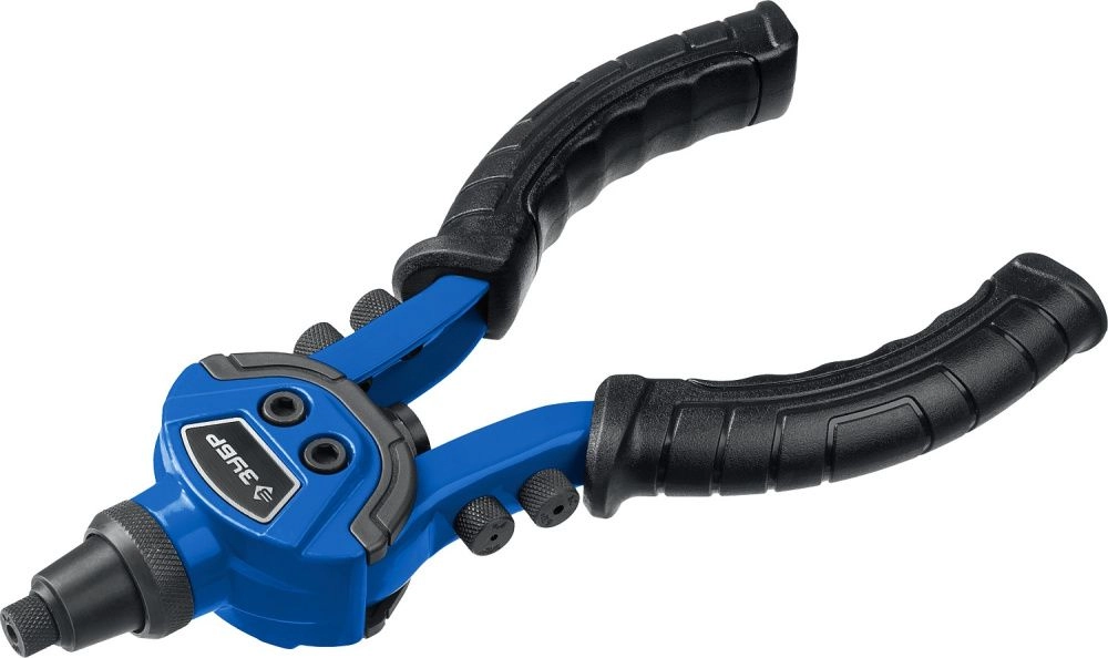 Применяется для установки вытяжных заклепок. Используется с нержавеющими заклепками 2.4, 3.2, 4.0, 4.8 мм, стальными и алюминиевыми заклепками 2.4, 3.2, 4.0, 4.8, 6.4 мм Способ применения: 1. Просверлите отверстие 2. Установите заклепку в заклепочник, а затем в отверстие 3. Сжимайте и разжимайте рукоятки заклепочника до момента откусывания хвостовика заклепки 4. Заклепка установлена