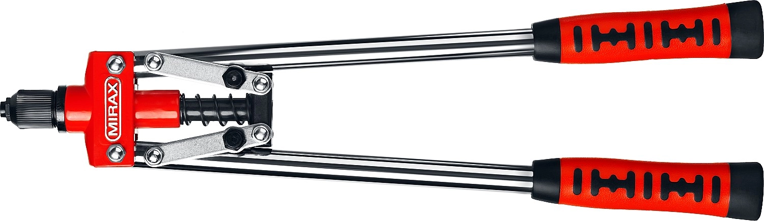 Заклепочник MIRAX благодаря двухрычажной конструкции механизма многократно увеличивает прилагаемое усилие, что позволяет снизить утомляемость при длительной работе.