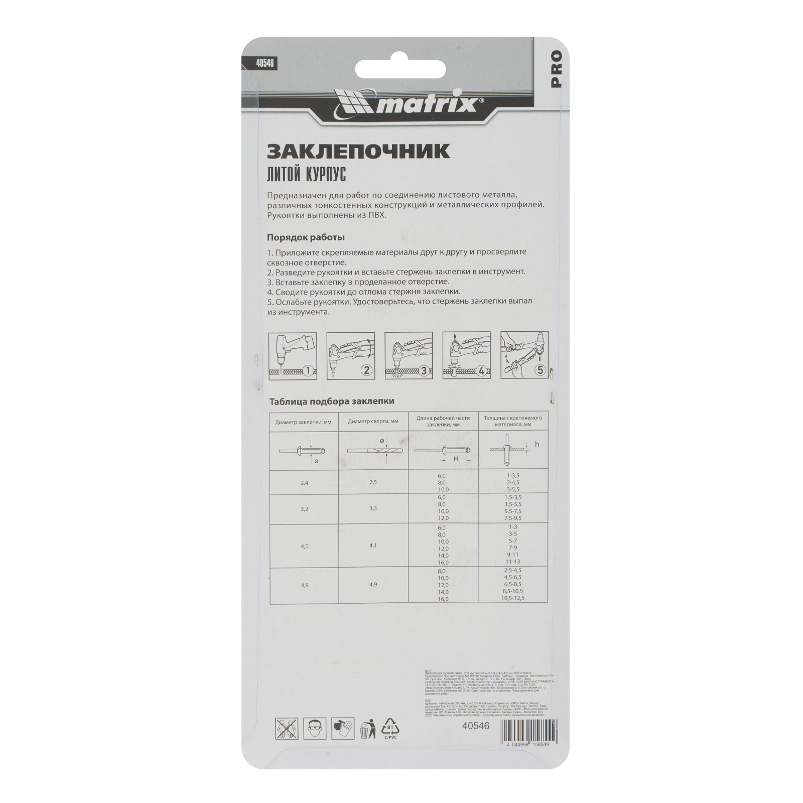 Заклепочник литой, 200 мм, заклепки 2,4-3,2-4,0-4,8 мм, PRO MATRIX 40546предназначен для скрепления металлических листов с помощью вытяжных заклепок. В комплект входят четыре насадки для заклепок 2.4, 3.2, 4.0 и 4.8 мм.
