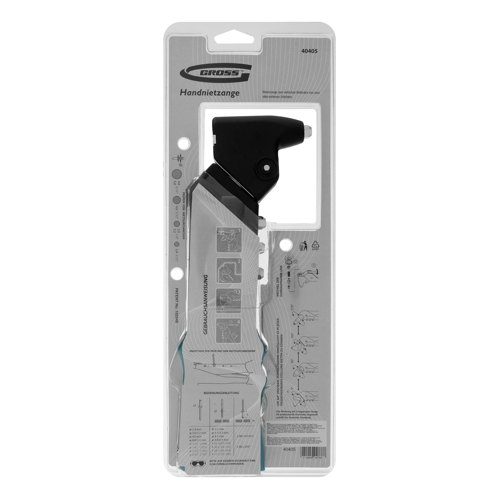 Литой усиленный заклёпочник Gross 40405, поворотный 0-360 градусов, применяется для соединения листовых заготовок, легких строительных конструкций и металлопрофиля. Инструмент совместим с заклёпками — стальными 2,4-3,2 мм, нержавеющими 2,4 мм и алюминиевыми 2,4-4,8 мм. Для всех размеров крепежей имеются соответствующие головки. Рабочая часть вращается на 360 градусов, поэтому инструмент оптимально подходит для работы в труднодоступных местах. Заклёпочник используется в профессиональной сфере — для строительства и ремонта, а также производства оборудования и мебели.Производитель: ООО "Мир инструмента", Россия