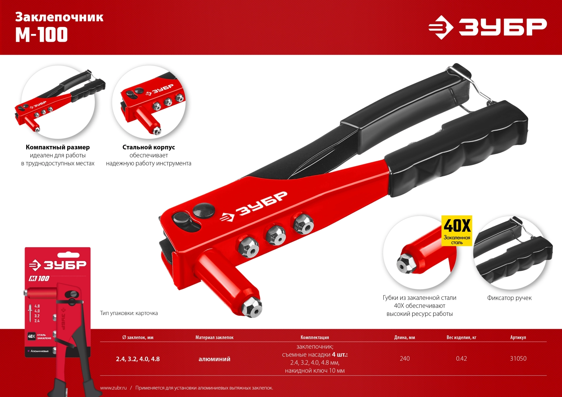 ПроизводителиЗаклепочник, для алюм. заклепок d=2,4-4,8 мм, cтальной корпус "МХ100" (31050_z01) ЗУБР