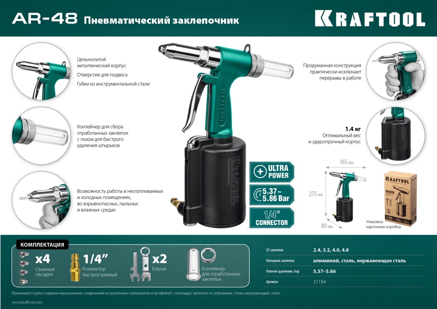 Заклепочник пневматический й Kraftool- инструмент высочайшего качества, предназначенный для профессионалов. Корпус из аллюминия , легкий и ударопрочный. Контейнер для сбора отработки.