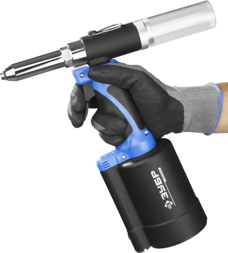 Возможность работы в неотапливаемых и холодных помещениях, во взрывоопасных, пыльных и влажных средах. Особая конструкция практически исключает перерывы в работе. Контейнер для сбора отработанных заклепок. Эргономичный корпус и рукотяка предотвращают появление преждевременной усталости при работе.