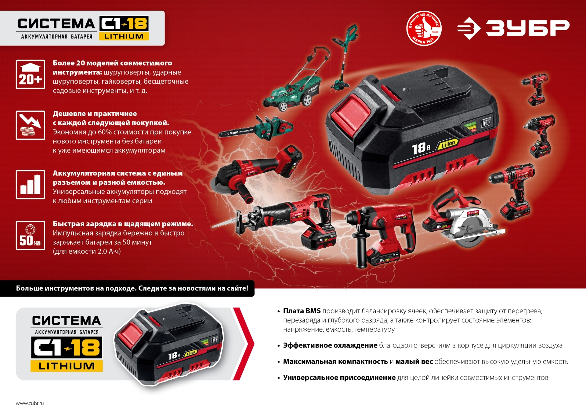 СТАНДАРТУровень качества. При классификации продуктов, имеющих схожее наименование, но обладающие различными потребительскими свойствами мы приняли следующий Вес факторов: 80% - подтвержденный ресурс, 15% - заявленная производительность/скорость, 5% - субъективные ощущения потребителя. ПодробнееКод товара: 0055466ХарактеристикиАртикул БЗУ-С1-12Бренды ЗубрСтрана производства КитайАккумуляторная система ЗУБР Li-Ion C1 12ВНапряжение аккумулятора 12Зарядное устройство Зубр БЗУ-С1-12, предназначено для зарядки батарей аккумуляторного инструмента. Управляется электроникой: диагностика состояния АКБ, контроль степени заряда и температуры, автоматическое отключение по окончании зарядки или при неисправности. Защита от повреждений зарядного устройства и аккумулятора: защита от перепадов напряжения в сети, от перегрева, от короткого замыкания, защита от переполюсовки контактов.