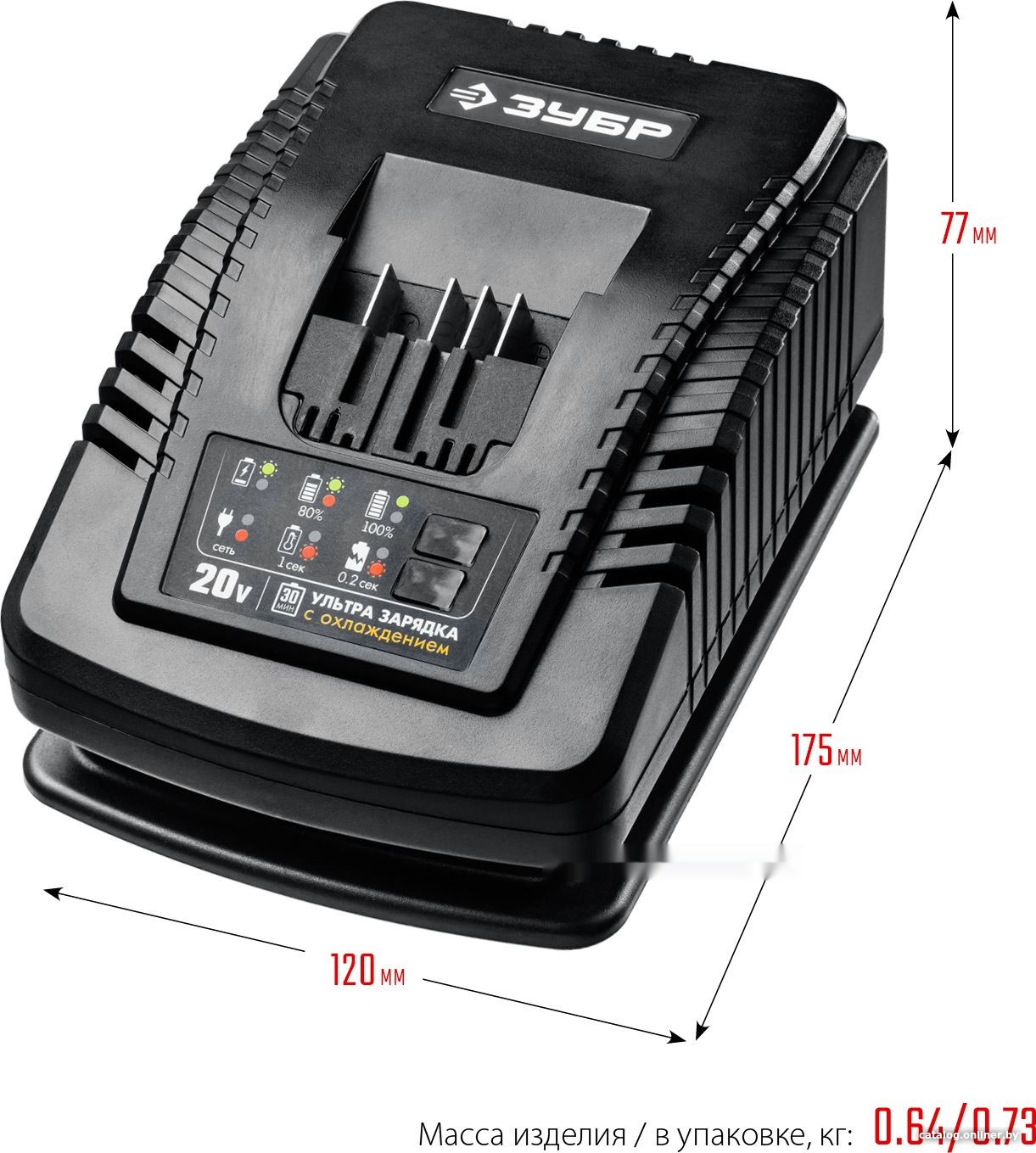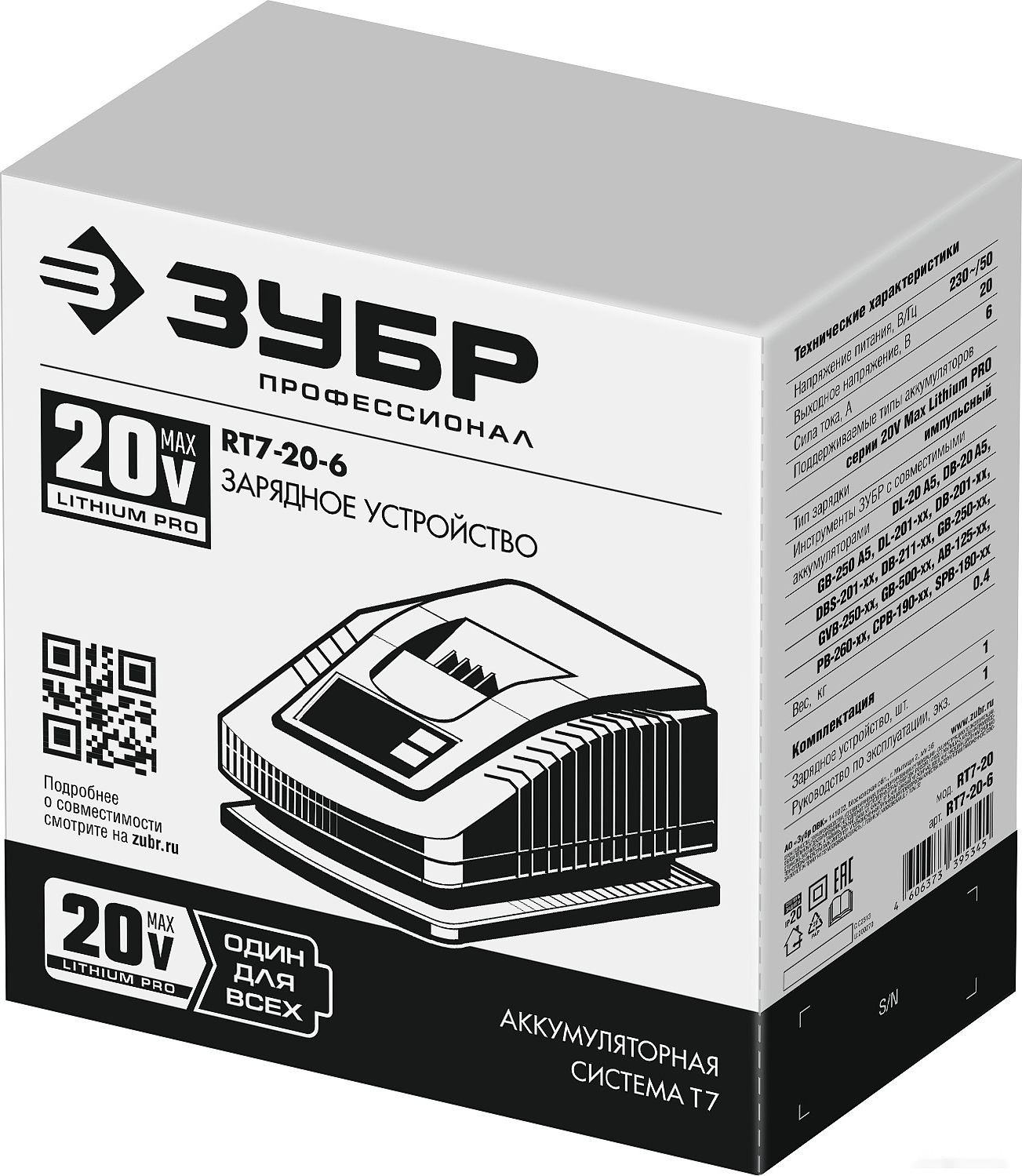 ХарактеристикиАртикул RT7-20-6Бренды ЗубрСтрана производства КитайАккумуляторная система ЗУБР Li-Ion PRO 20BТип зарядноеНапряжение аккумулятора 16-20Назначение для садового инструмента, для строительного инструментаТип аккумулятора Li-ionВыходное напряжение 20Индикатор уровня зарядки ДаБеспроводная зарядка НетОписание товара обновлено 08.12.2025 13:40:16Зарядное устройство Зубр RT7-20-6, предназначено для зарядки батарей аккумуляторного инструмента.