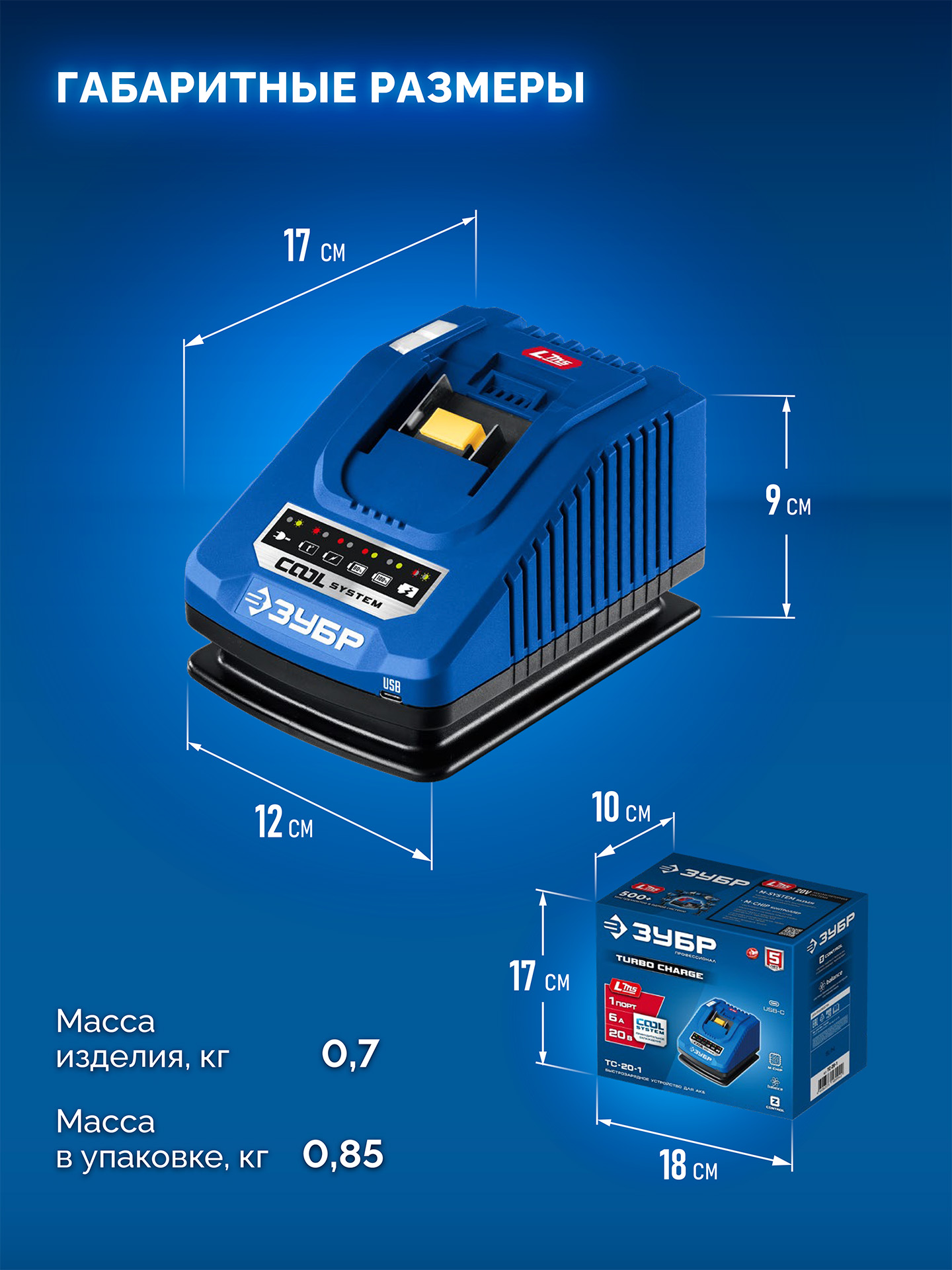 ПроизводителиЗарядное устройство 20.0 В, для LMS Li-Ion АКБ, 1 порт х 6.0 А/h (TC-20-1) ЗУБР