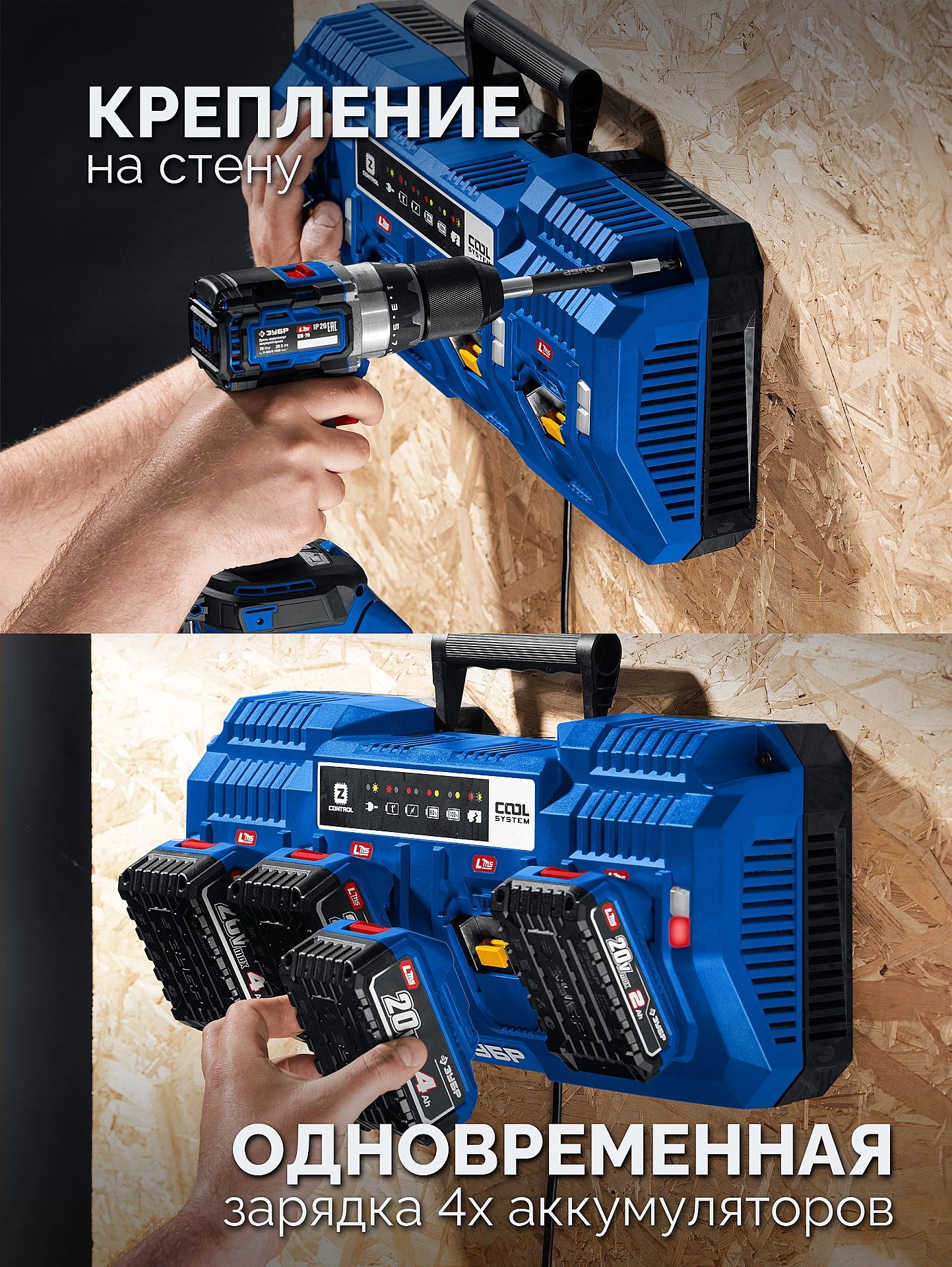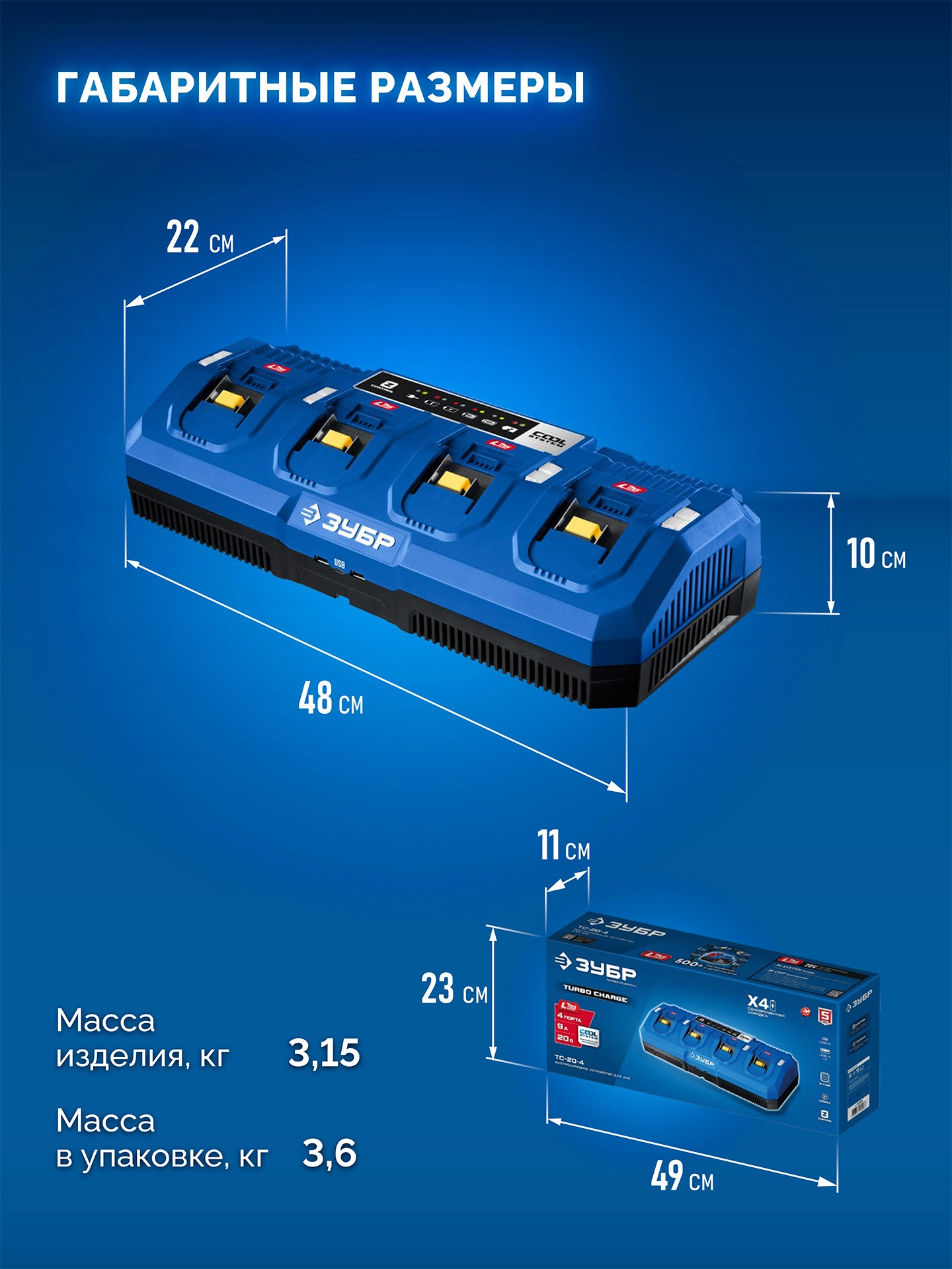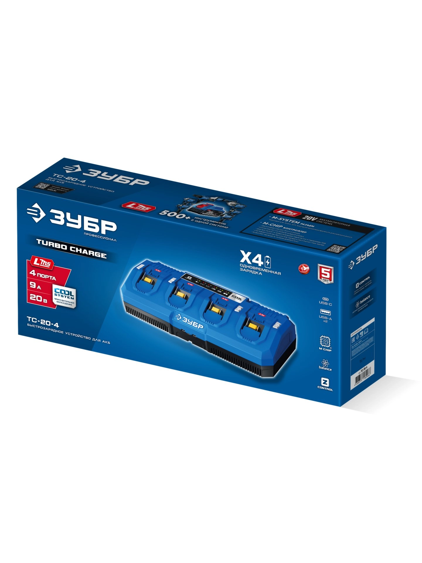 ПроизводителиЗарядное устройство 20.0 В, для LMS Li-Ion АКБ, 4 порта х 9.0 А/h (TC-20-4) ЗУБР