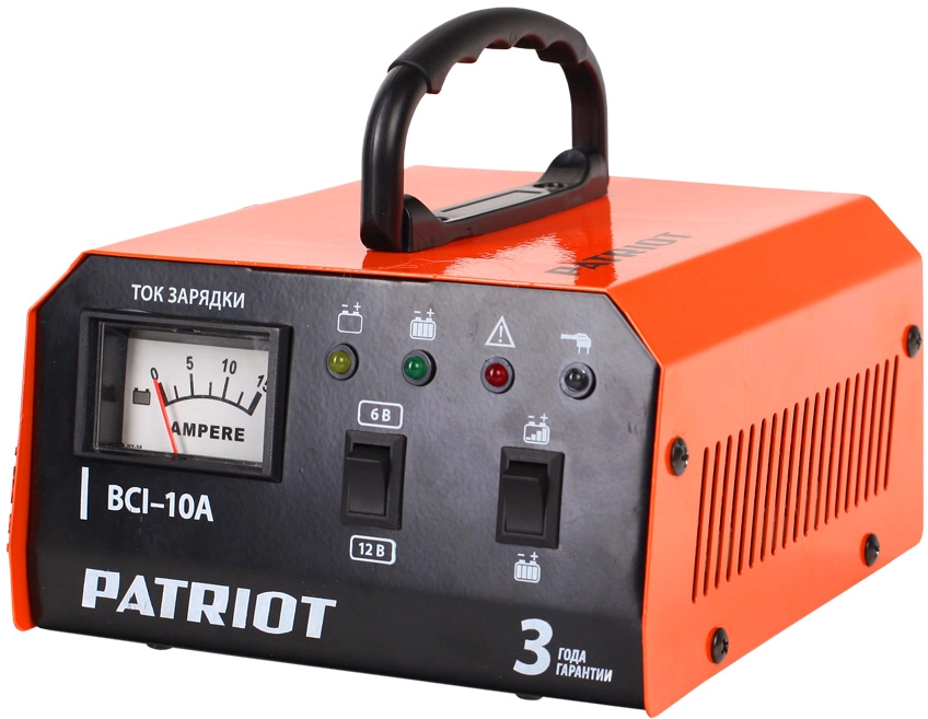 СТАНДАРТУровень качества. При классификации продуктов, имеющих схожее наименование, но обладающие различными потребительскими свойствами мы приняли следующий Вес факторов: 80% - подтвержденный ресурс, 15% - заявленная производительность/скорость, 5% - субъективные ощущения потребителя. ПодробнееКод товара: 0062411ХарактеристикиАртикул 650303410Бренды PATRIOTСтрана производства КитайГарантия 12 месяцевГабариты (ШхВхГ),мм 180х240х115Тип зарядноеНапряжение аккумулятора 6/12Цвет черный/оранжевыйТемпературный режим использования ˚С от -20 до +40Емкость аккумулятора 400Длина сетевого шнура 1.5Защита от перегрева естьТип аккумулятора AGMКоличество заряжаемых аккумуляторов, шт 1Наличие дисплея нетЗащита от перегрузки естьЗащита от неправильного подключения нетКоличество ступеней зарядки 8Вес 1.3Мин. Емкость заряжаемых батарей 10Номинальное напряжение батареи 6Мин. Ток зарядки 0Макс. Емкость заряжаемых батарей 150Макс. Ток зарядки 10Потребляемая мощность на заряд 400Напряжение 220Материал пластикШирина в упаковке 25Высота в упаковке 18Глубина в упаковке 12Индикатор уровня зарядки ДаИндикация завершения зарядки ДаОписание товара обновлено 28.01.2026 17:03:57Преимущества зарядного устройства Patriot BCI 10A