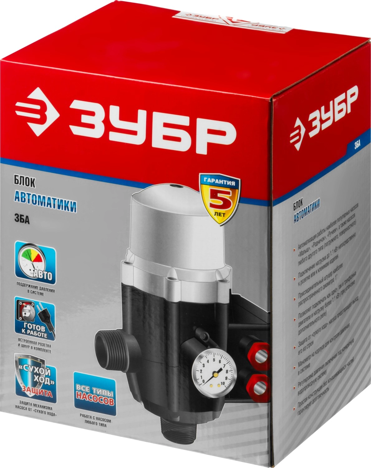 ХарактеристикиАртикул ЗБАБренды ЗубрСтрана производства КитайПотребляемая мощность 1100Макс. температура жидкости, °С 60 °CВес 1.65Установка данного устрройства превращает практически любую систему водоснабжения на приусадебном участке в автоматическую с постоянным поддержанием давления. Работает с любым насосом (погружным, поверхностным, центробежным, вибрационным). Более правильный алгоритм отключения по контролю за расходом, а не давлением.